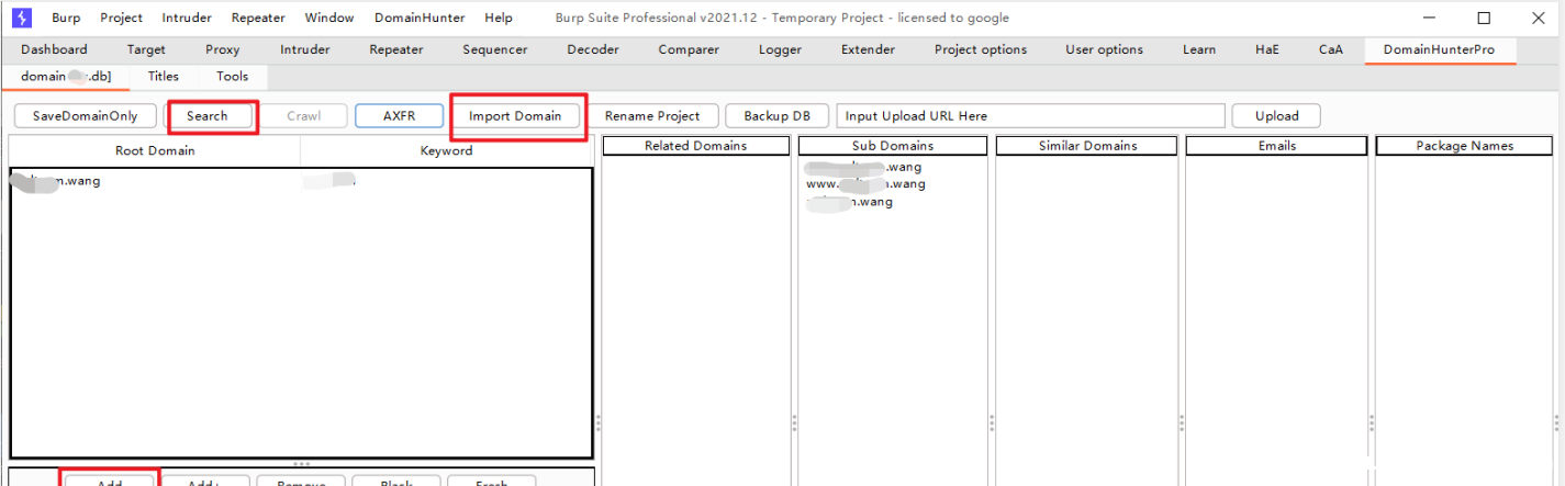 之后你只需要添加Root Domain(根域名)[使用Add或者是上方的Import Domain],并开始点击你的目标网站。最后,你觉得你点的差不多了,就可以点击上方的search 就可以出来他找到的子域名