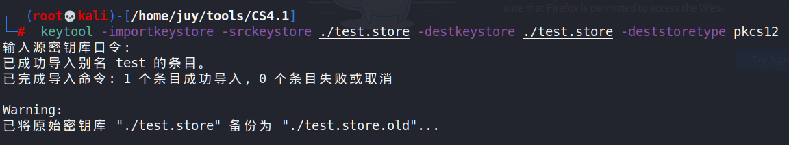 后来我发现这个证书并没有替换原先的,而是在此基础上添加证书内容,因此我把原来的cobaltstrike.store删除,重新生成一个新证书